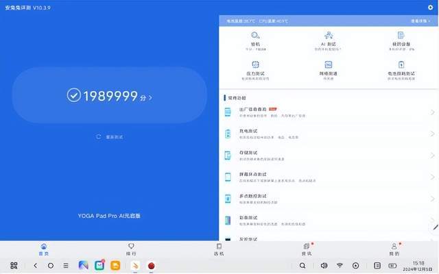 照例,我们给YOGA Pad Pro AI元启版跑个分,该机在安兔兔V10测试中获得1989999,Wild Life Extreme重压测试获得8015分,在平板这个品类已经是TOP级别。
