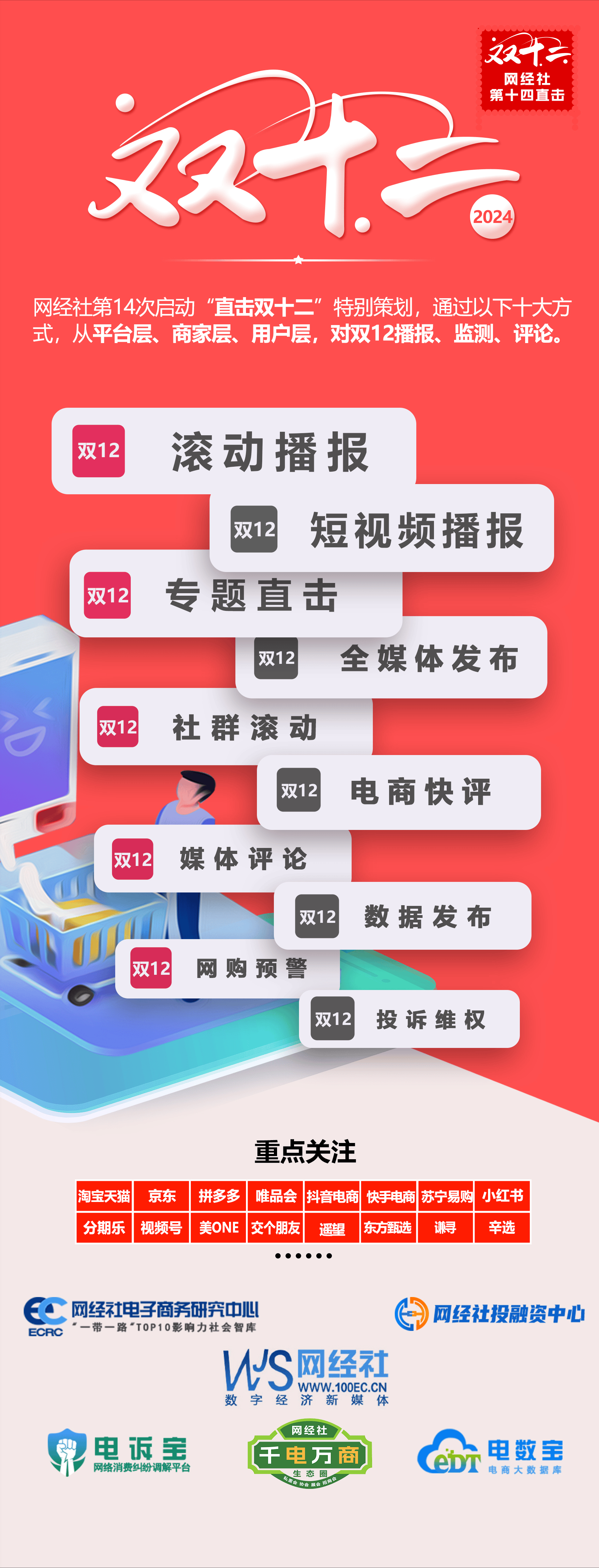 “直击双十二”特别系列策划,通过滚动播报、短视频播报、专题直击、全媒体发布、媒体评论、投诉维权等方式报道,密切跟踪天猫、淘宝、京东、拼多多、苏宁易购、唯品会、抖音电商、快手电商等各大电商,对双12持续播报、监测、评论。