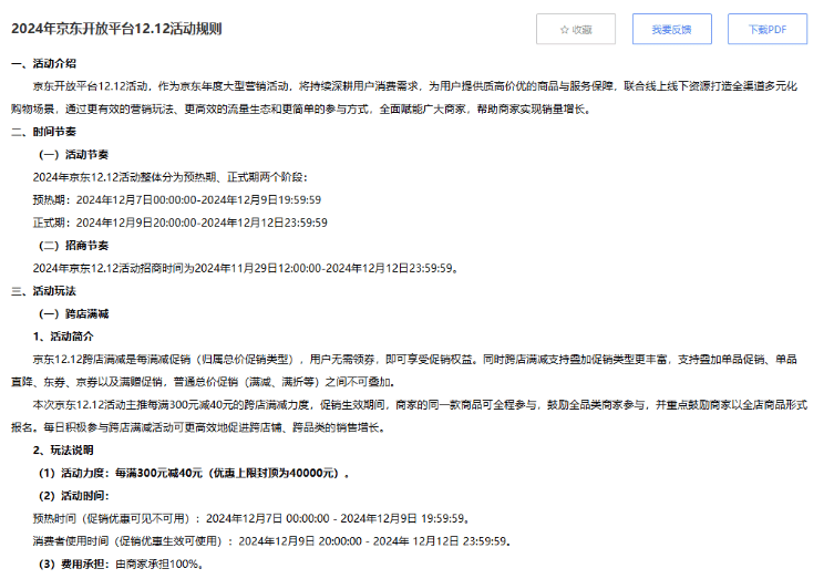 今年京东双12的主要活动玩法为跨店满减满300元减40元。全品类商家均可参与跨店满减活动,活动费用由商家100%承担。平台鼓励商家以全店商品形式报名。京东将在推荐、搜索、凑单页、会场等公域场景为跨店满减商品提供流量支持。同时,京东双12商品打标活动延续了双11的“打标免报名”方式。商家全店满足招商规则的商品将由系统自动圈选打标,不需要商家再进行报名。