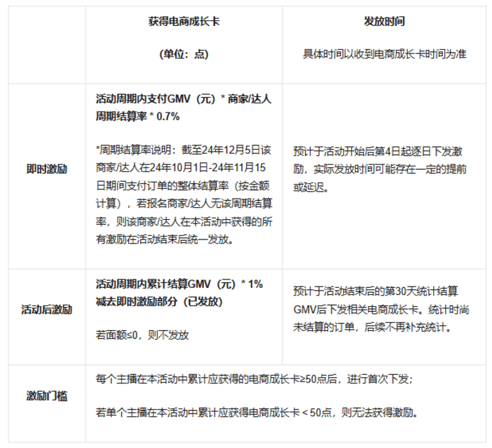 11月26日,微信小店12.12年终好物节活动激励计划公布,活动周期为2024年12月6日20:00:00至2024年12月12日23:59:59。活动期间,作为带货主播选择“购物”类目开播,累计成交数据满足对应目标门槛并符合活动要求,可获得对应电商成长卡激励。单个主播账号在本活动中,即时激励部分最多可获300,000点电商成长卡激励;即时激励加活动后激励累计最多可获得600,000点电商成长卡激励。