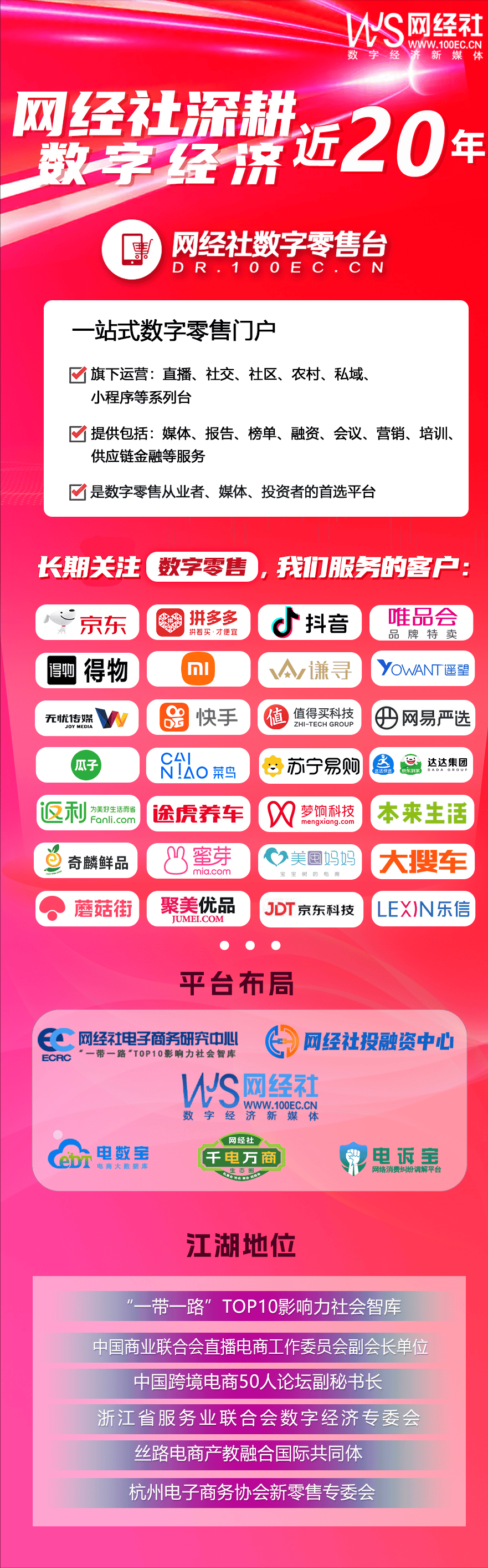 深耕数字经济行业近20年,长期关注数字零售,旗下数字零售台服务的客户有:京东、拼多多、抖音、快手、唯品会、遥望、谦寻、达达集团、小米、得物、网易严选、苏宁易购、什么值得买、返利网、途虎养车、梦饷科技、本来生活、奇麟鲜品、京东科技、蜜芽、美囤妈妈、乐信、大搜车、瓜子二手车、蘑菇街、聚美优品、无忧传媒、菜鸟等。