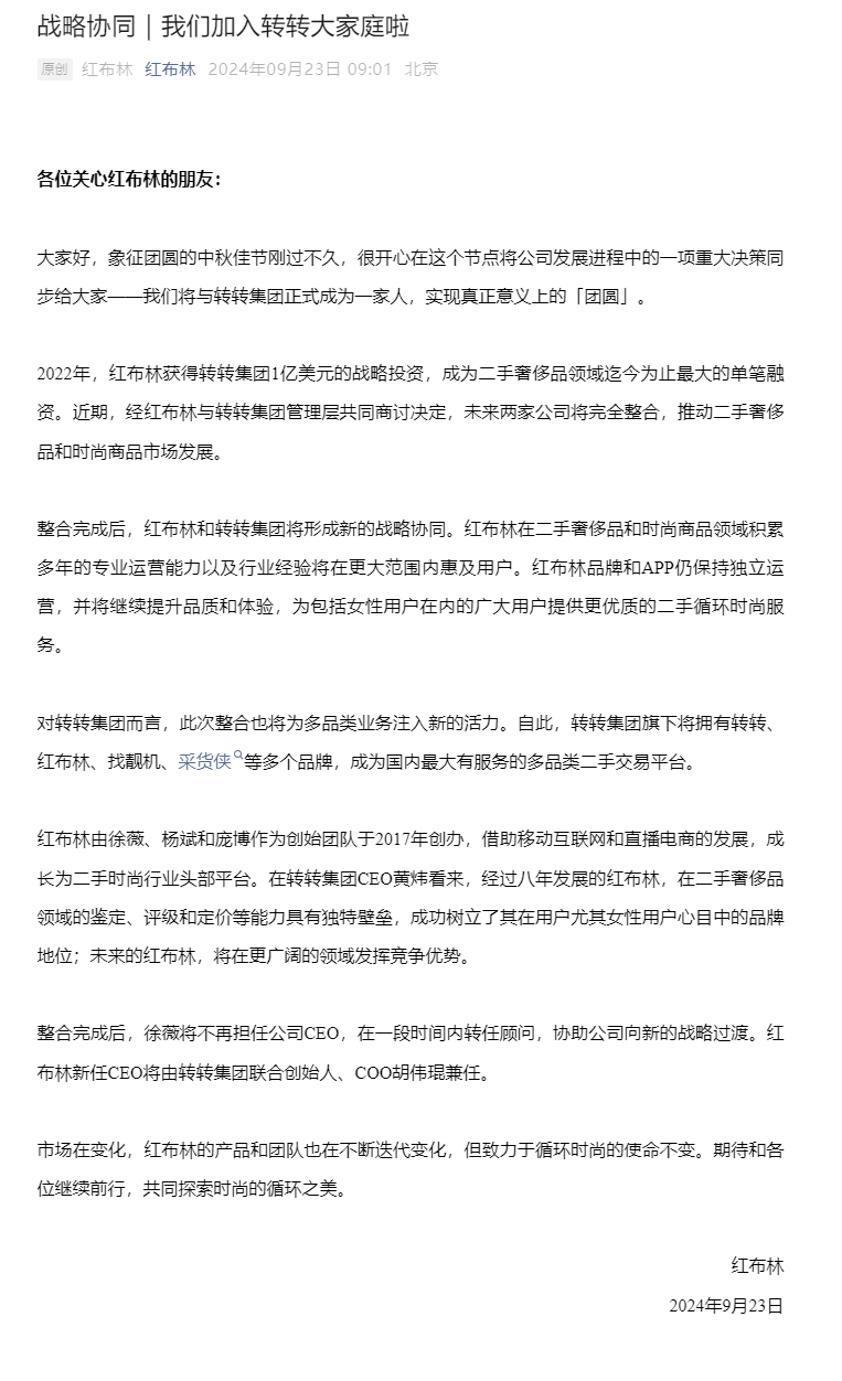 9月23日,红布林发布公告,继2022年红布林获得转转集团1亿美元的战略投资后,双方将形成新的战略协同。红布林品牌和APP仍保持独立运营,并将继续提升品质和体验,为包括女性用户在内的广大用户提供更优质的二手循环时尚服务。