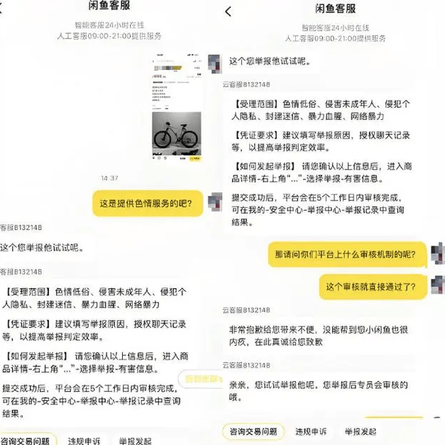 闲鱼官方客服作出回应称,闲鱼平台一直以来都坚定对色情低俗内容的严厉打击决心,同时也不断加大对网络整改的力度,定期公示违法违规相关账号及内容,营造健康向上的网络环境是我们坚定不移的努力方向,欢迎广大网友的监督与举报。此外,平台也会“自检自查”。用户若发现有卖家提供“涉黄”服务,也可以向平台进行投诉举报。如果查实,会对账号封号或者限制使用。