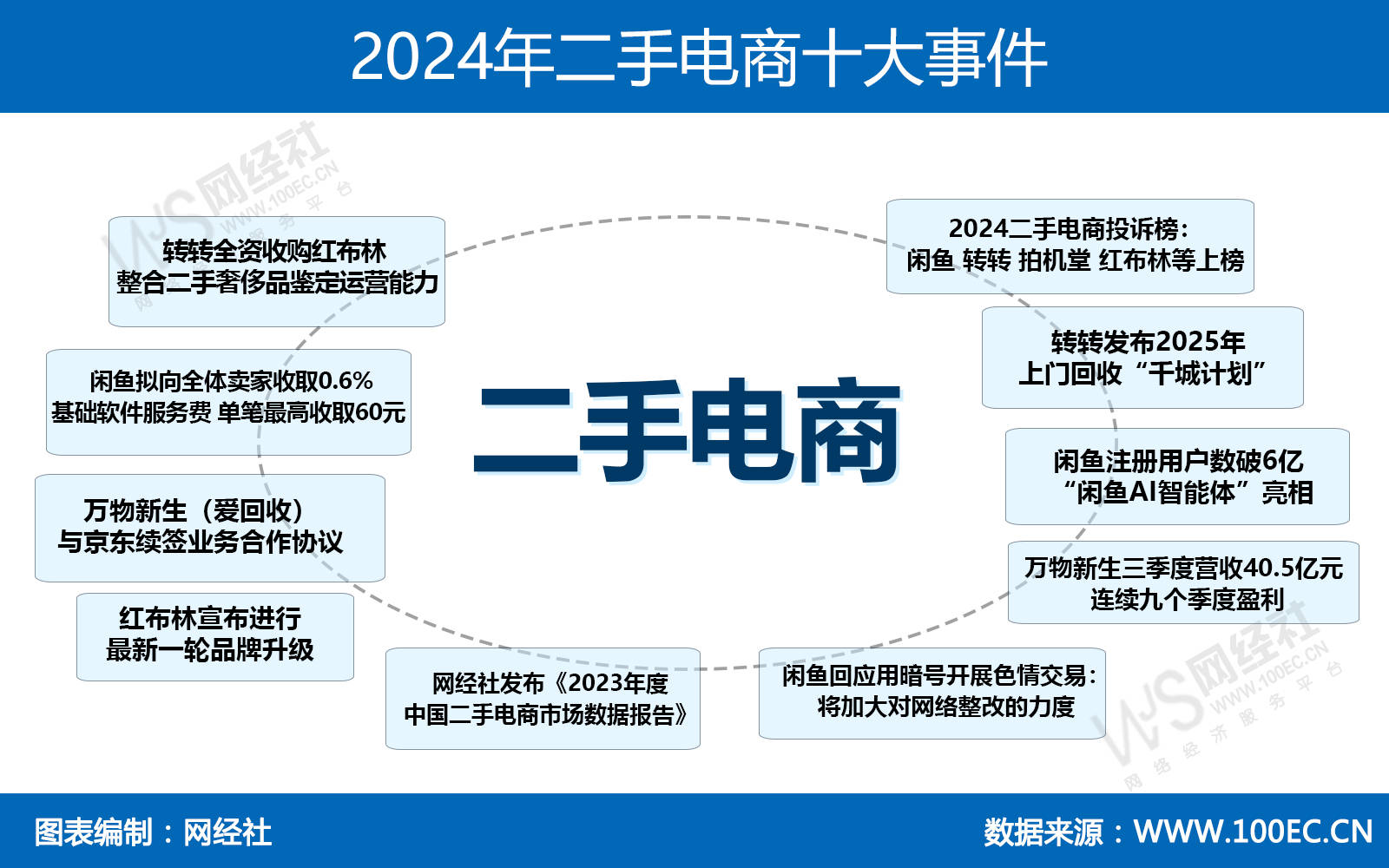 2024年,二手电商行业竞争日益激烈:闲鱼拟向全体卖家收取0.6%基础软件服务费、转转发布2025年上门回收“千城计划”;此外,平台之间的整合仍在继续:转转全资收购红布林、万物新生(爱回收)与京东续签业务合作协议。对此,数字零售台对2024年二手电商十大事件进行盘点回顾。