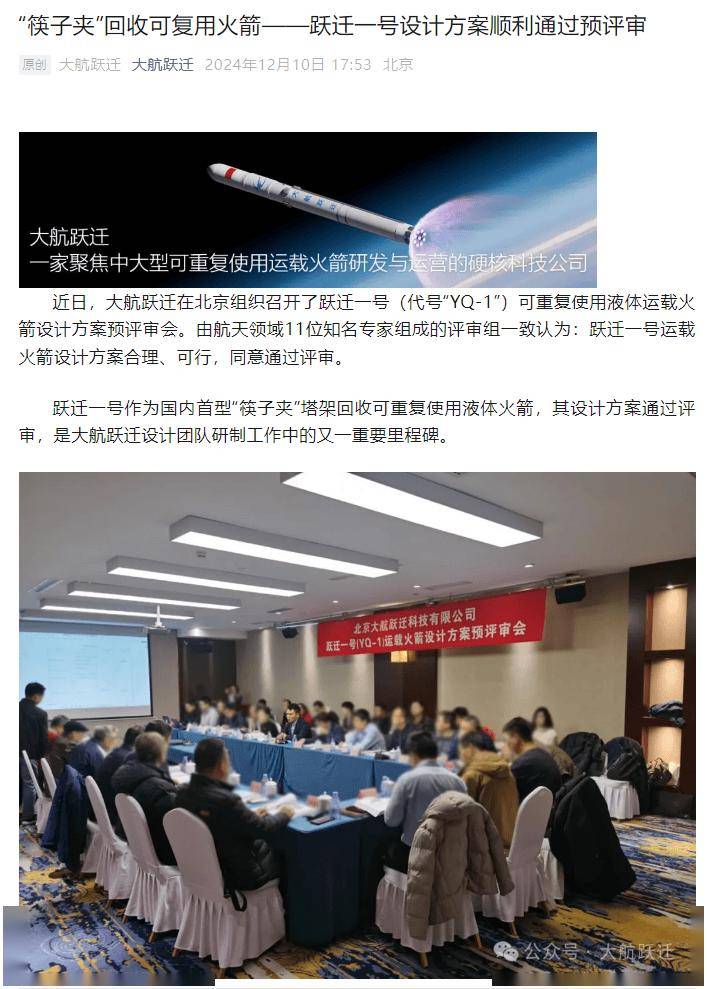 12 月 10 日消息,大航跃迁科技有限公司(以下简称“大航跃迁”)今日宣布,该公司通过了跃迁一号(YQ-1)可重复使用液体运载火箭设计方案预评审会,评审组一致认为跃迁一号运载火箭设计方案合理、可行,同意通过评审。