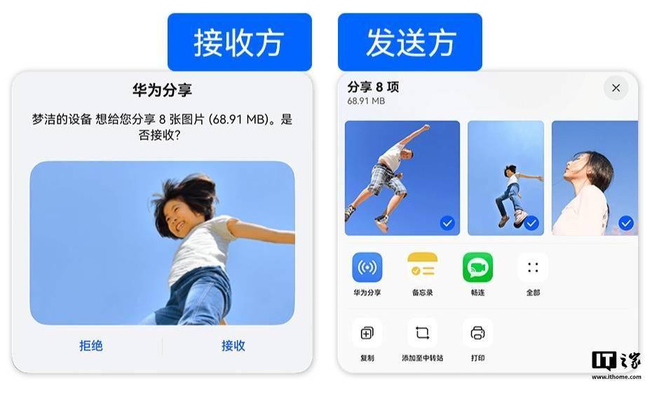 注意到,视频中提到鸿蒙 HarmonyOS NEXT 系统“华为分享”功能支持多人群发特性:用户在发起分享后,可在“华为分享”界面点击多台设备进行分享。