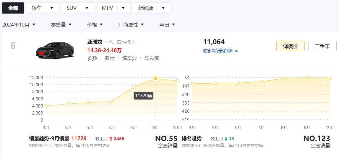 从销量上来看,亚洲龙在10月份的销量数据为11064辆,而9月份则取得了11729辆新车的销量成绩单。很显然,10月相较9月销量是有下滑的,而或许也正是因为看到了这种“征兆”,加上12月又到了年底冲量的时候,所以厂家这才在12月份为亚洲龙2.0L推出了新的“限时一口价”政策。