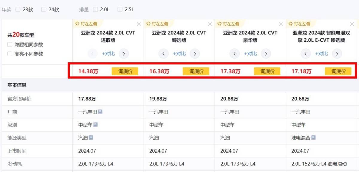 从价格上来看,最新的2024款丰田亚洲龙2.0L车型售价是17.88万起,相较以前也是有所下调的。不过,如今厂家迫于市场竞争压力,直接将原本17.88万的起售价给限时优惠到13.98万元起,从一定程度上来说这也证明,一汽丰田当下的卖车处境是不太乐观的。