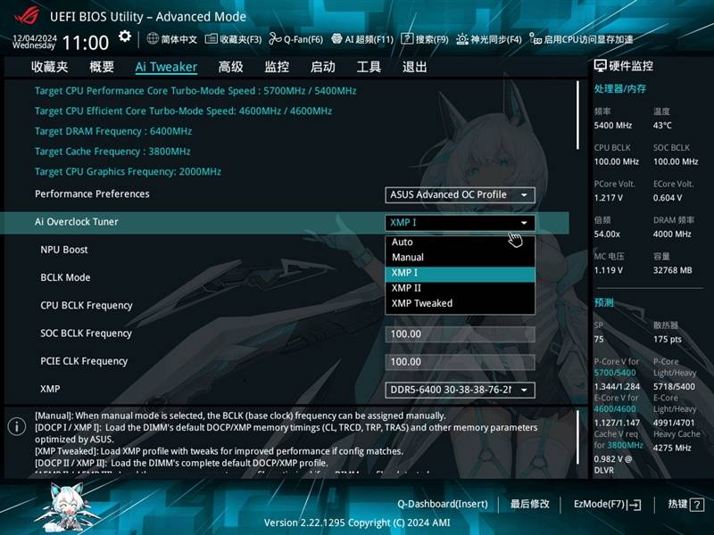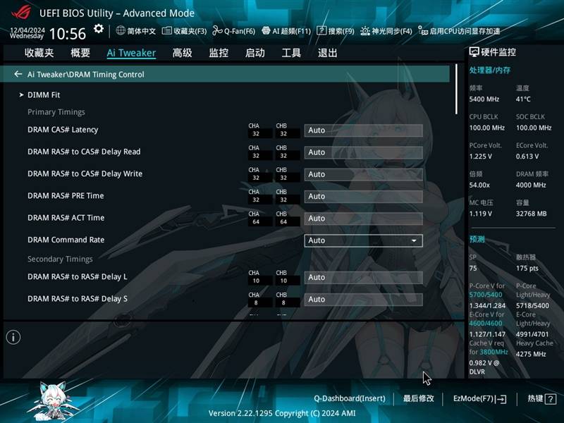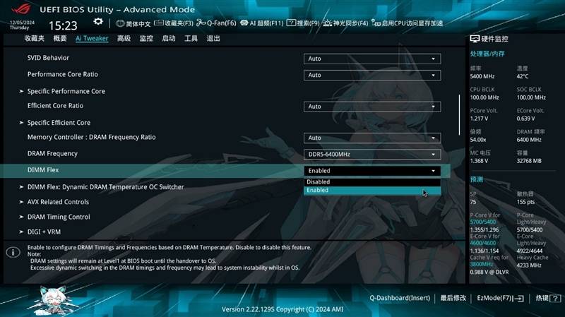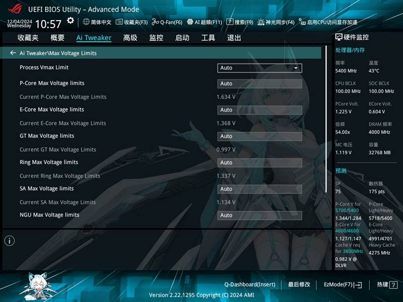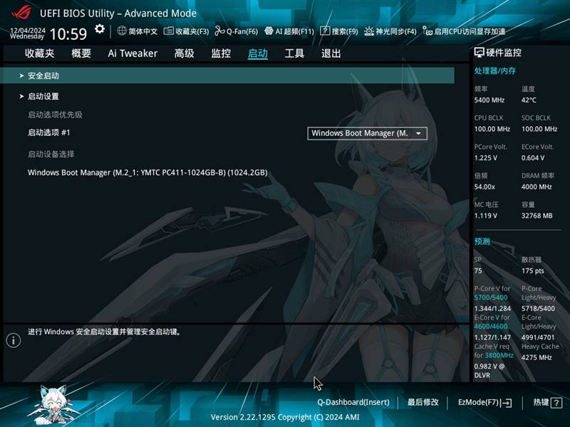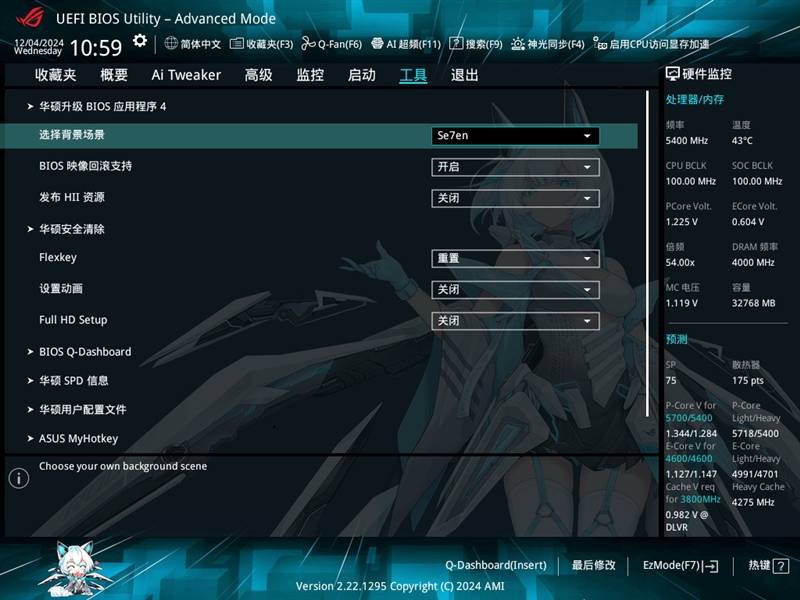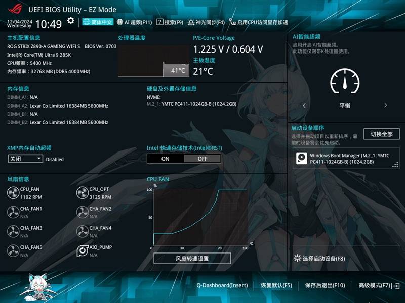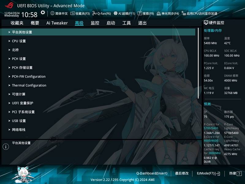 进入华硕ROG STRIX Z890-A GAMING WIFI S吹雪主板的BIOS界面,可以看到它默认就是雪武战姬的背景主题。