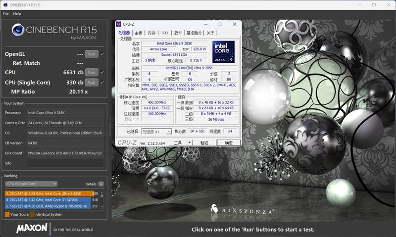 CINEBENCH R15测试,CPU单核成绩330,多核成绩6631。