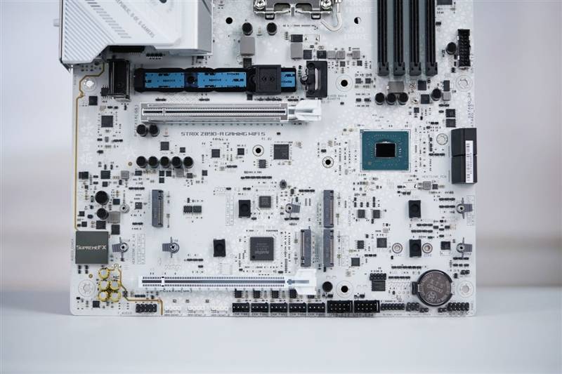 拆下散热片之后可以看到华硕ROG STRIX Z890-A GAMING WIFI S吹雪主板的主板芯片和5个M.2插槽。