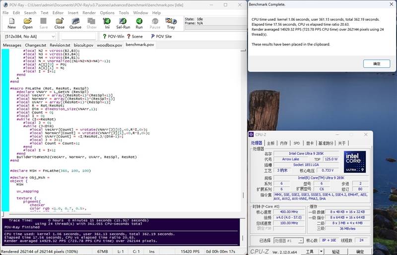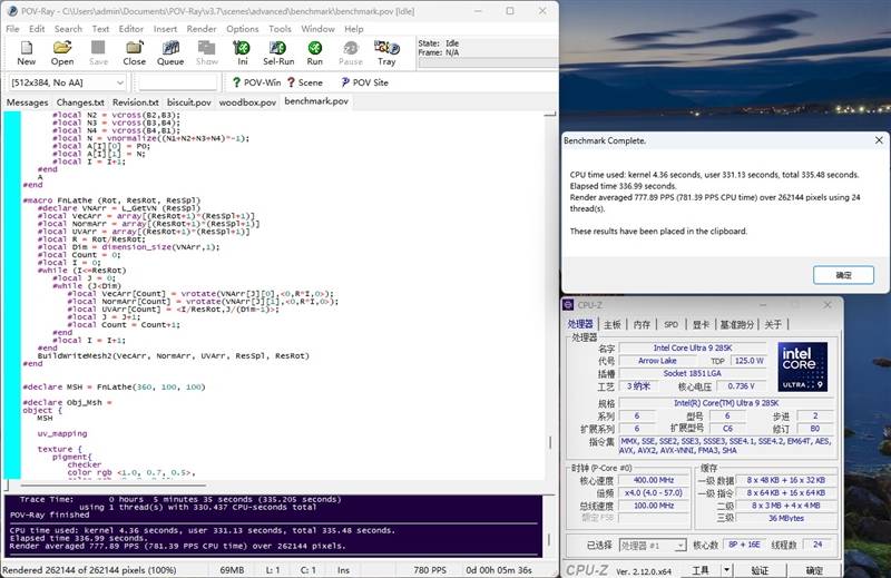 POV-Ray测试中,单核成绩为777.89,多核成绩为14929.32。
