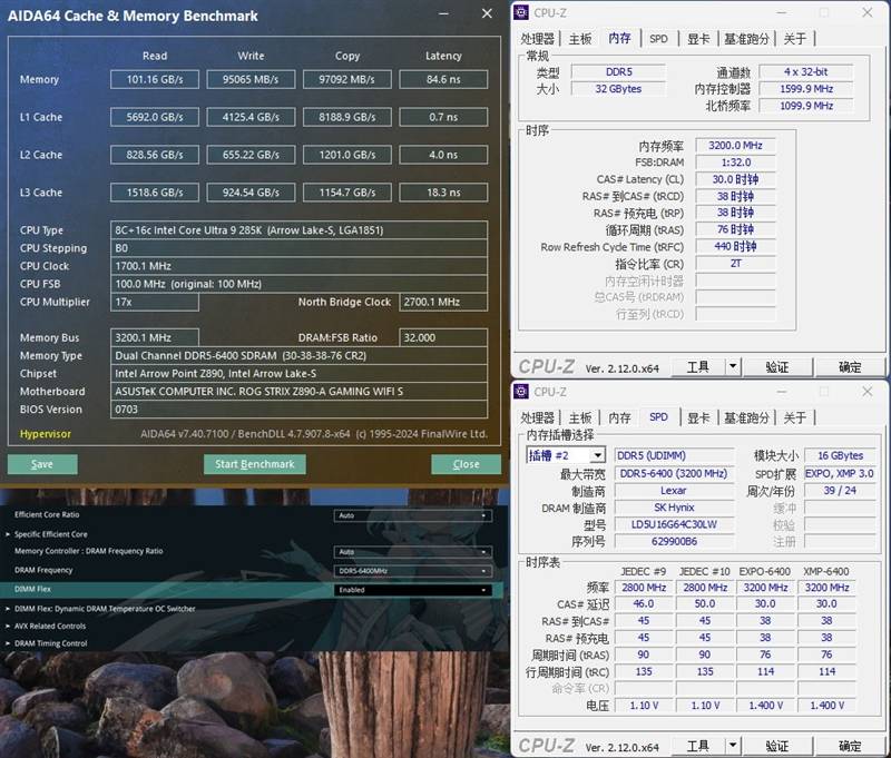 我们额外开启华硕的DIMM FLEX功能之后,主板会自动加载内存XMP Tweakde配置,然后再次进行内存测试,内存读取、写入和拷贝速度分别是101.16 GB/s、95965 MB/s和97092 MB/s,延迟为84.6ns。