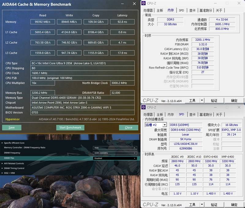 华硕ROG STRIX Z890-A GAMING WIFI S吹雪主板开启内存XMP模式后,内存读取、写入和拷贝速度分别是99392 MB/s、89445 MB/s和109.54 GB/s,延迟为92.8ns。