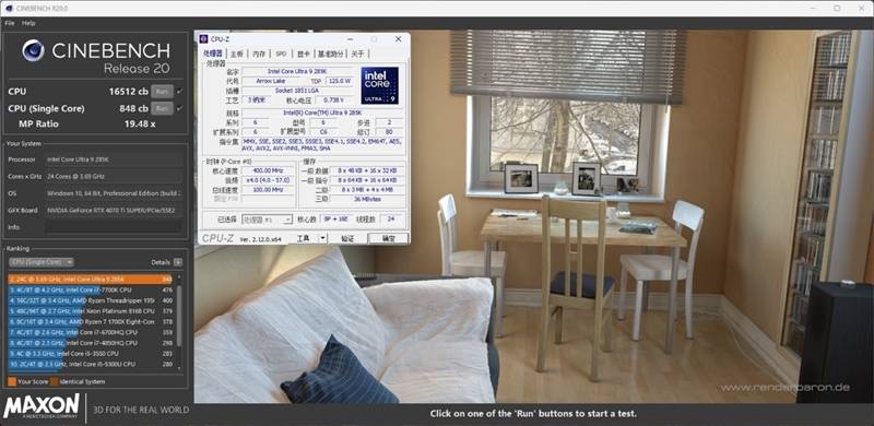 CINEBENCH R20测试,CPU单核成绩848,多核成绩16512。
