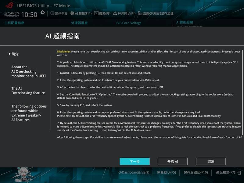 如果不熟悉这些BIOS设置的话,可以直接启动华硕提供的AI自动超频,把这些设置都交给主板自行判断。