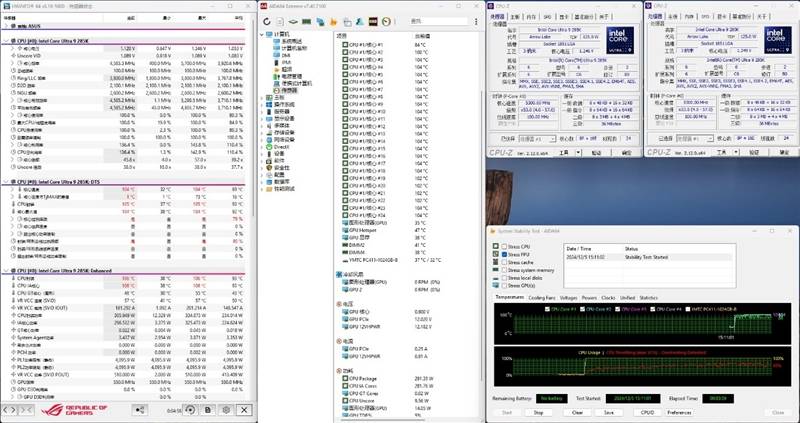 我们在华硕ROG STRIX Z890-A GAMING WIFI S吹雪主板上安装一颗英特尔酷睿Ultra 9 285K进行烤机测试,可以看到烤机刚开始时CPU功率高达334W,由于我们没有额外对CPU温度进行限制,105度的温度对CPU来说有些太极限,所以经过3分钟的短时间烤机之后,功率稳定在300W左右。