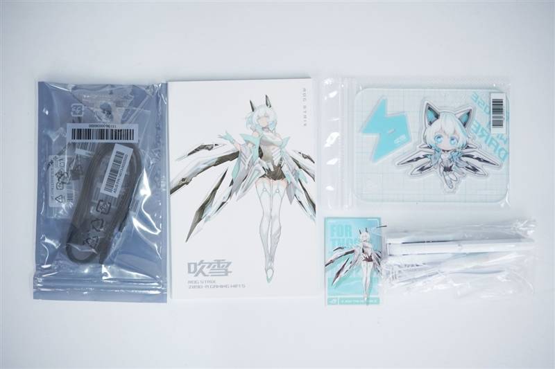 主板附带的说明书,SATA线,支持便捷拆装的WiFi-7天线和雪武战姬立牌等周边。