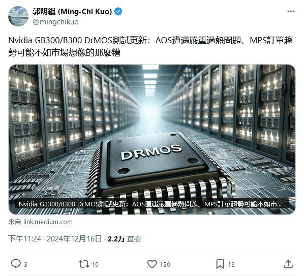 12 月 17 日消息,天风证券分析师郭明錤今天(12 月 17 日)发布投资研究报告,表示英伟达正为 GB300 和 B300 开发测试 DrMOS 技术,发现 AOS 的 5x5 DrMOS 芯片存在严重过热问题。这一问题可能影响系统量产进度,并改变市场对 AOS 订单的预期。
