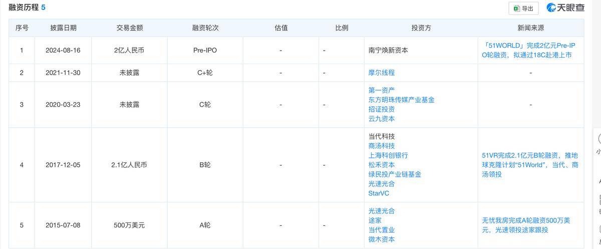 天眼查APP显示,据不完全统计,从2015年以来51WORLD经历了多轮融资,资方包括摩尔线程、商汤科技以及一些产业基金和风投机构。从时间来看,A轮融资到现在已经有9年的时间。