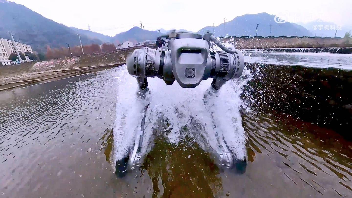 该机器狗还具备急速涉水、轻松攀爬湿滑的石头坡等等,行进途中,遇到树桩、大石头等障碍物时,机器狗可以直接飞跃过去,此外还可以托着人稳定前进。附上相关截图如下: