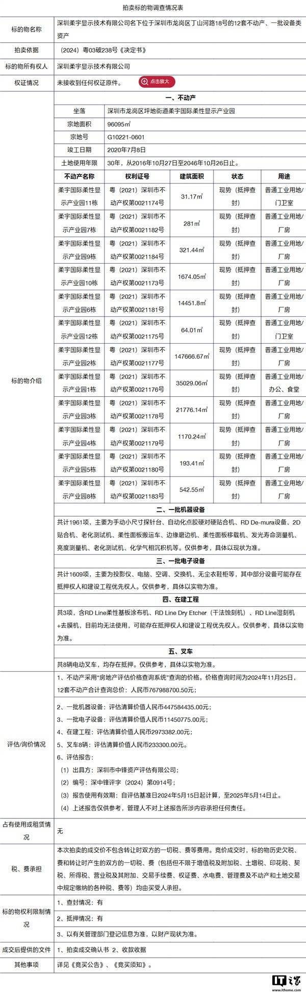拍卖平台显示,本次拍卖标的物为深圳柔宇显示技术有限公司名下位于深圳市龙岗区丁山河路 18 号的 12套不动产、一批设备类资产。