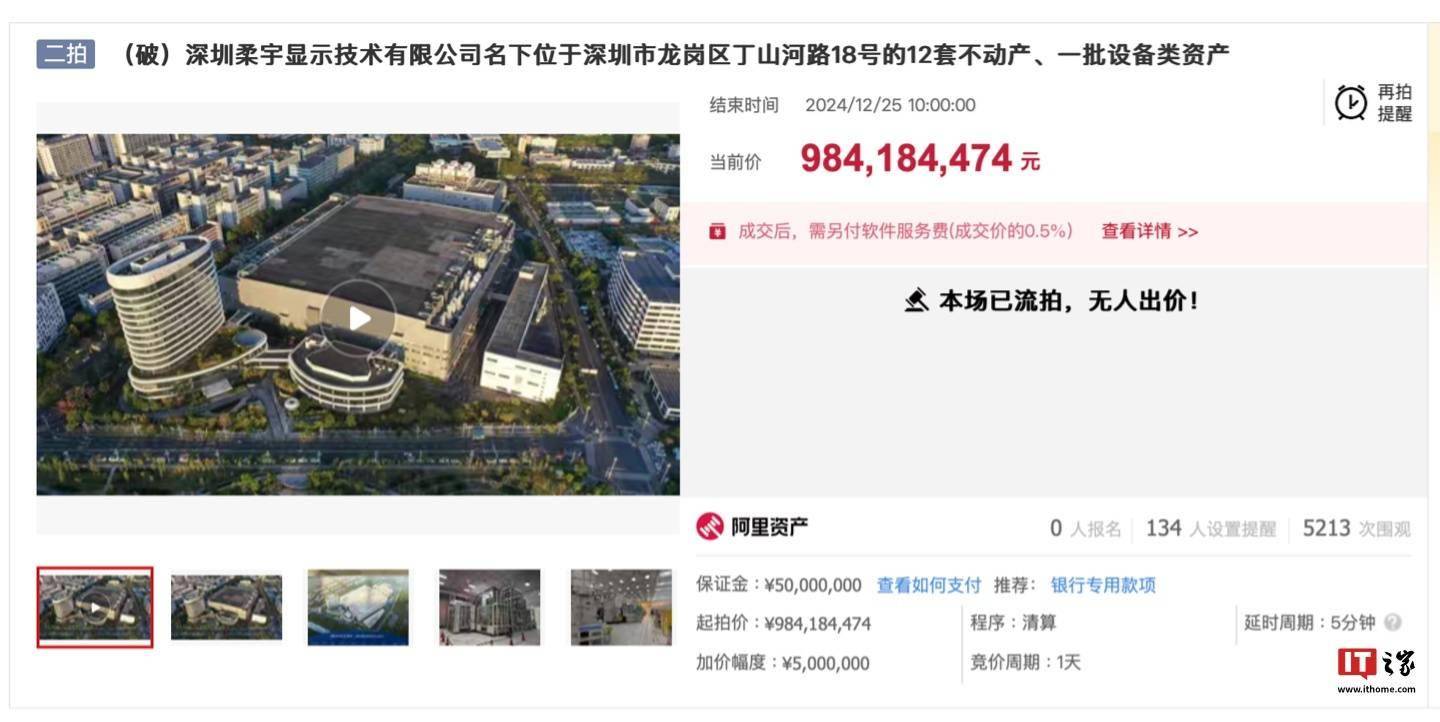 此后,柔宇显示公司名下资产于 12 月 24 日上午 10 点进行了第二次拍卖,降价约 2.5 亿元,定价 9.8 亿元(984,184,474 元),今日(12 月 25 日)10 点结束,据 10:19 公布的竞价结果显示,本场拍卖依然因无人出价而流拍。