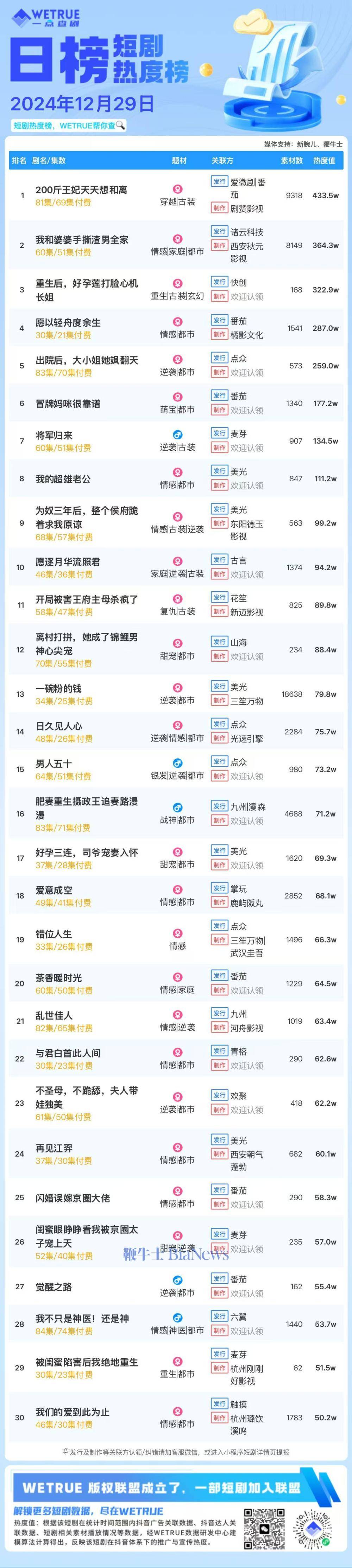 编者按:为帮助短剧从业者提供更多信息,专注于短剧报道的新腕儿和科技媒体鞭牛士联合WETRUE短剧热度榜共同推出短剧热度榜。
