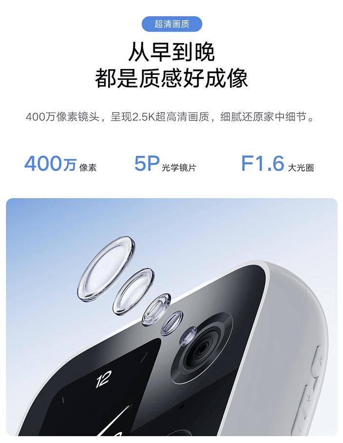 功能方面,该摄像机内置天气、温度、时钟信息,支持米家 App 设置自定义闹钟,摄像机支持与手机微信双向呼叫视频通话和米家视频通话,拥有实时人形检测,支持 5 米内拾音。