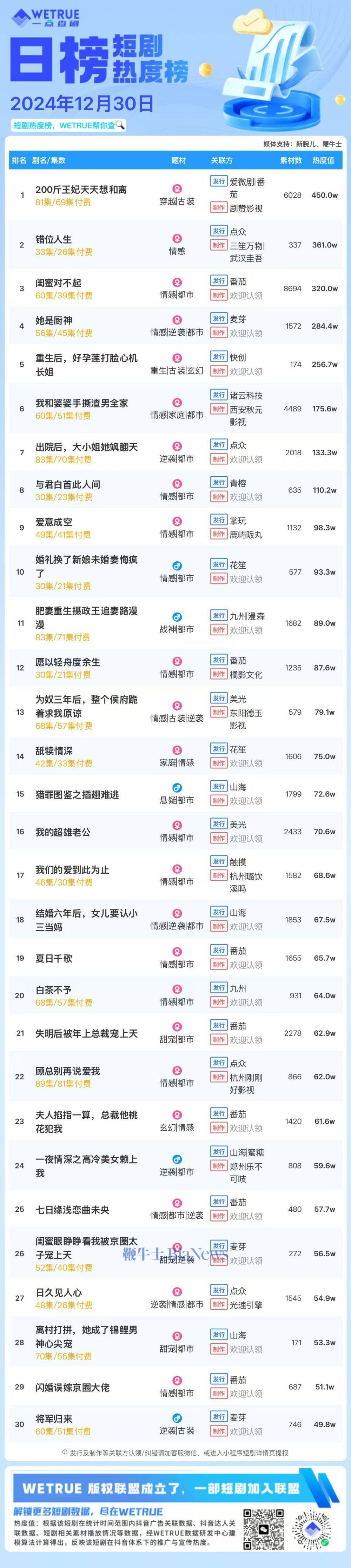 编者按:为帮助短剧从业者提供更多信息,专注于短剧报道的新腕儿和科技媒体鞭牛士联合WETRUE短剧热度榜共同推出短剧热度榜。
