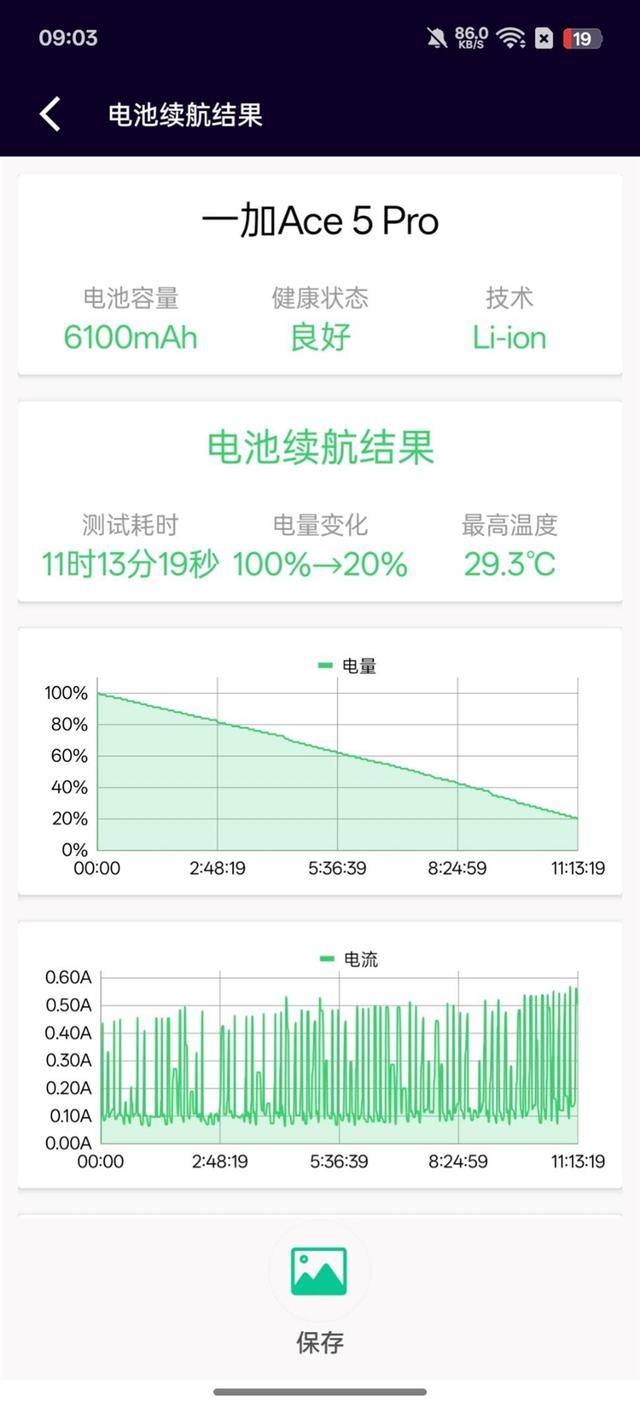 经过电池狗狗不间断测试,一加Ace 5 Pro的电量从100%消耗至20%用时11小时13分钟19秒,经过折算,满电续航大约可以达到14个小时左右,这一表现在性能旗舰机型中名列前茅,也是我们截至目前为止测试过的骁龙8至尊版的续航之最(游戏手机除外),即使是重度游戏玩家,也能轻松实现一天一充,续航能力堪称优秀。