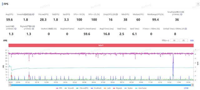 在原始画质+原始分辨率下,位于黄金的时刻跑图测试15分钟,游戏的平均帧率稳定在了59.6FPS,平均波动1.8。
