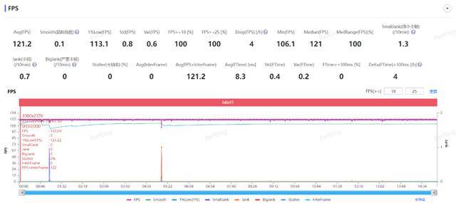 经过测试,游戏的平均帧率拉到了121.2FPS,平均波动甚至比原始帧率还要高。