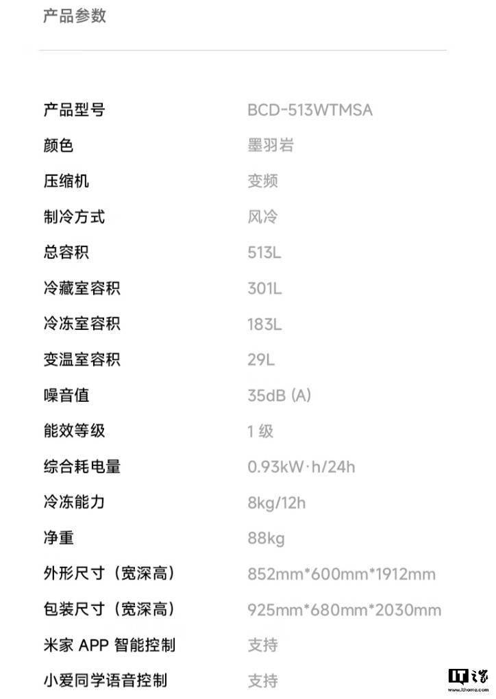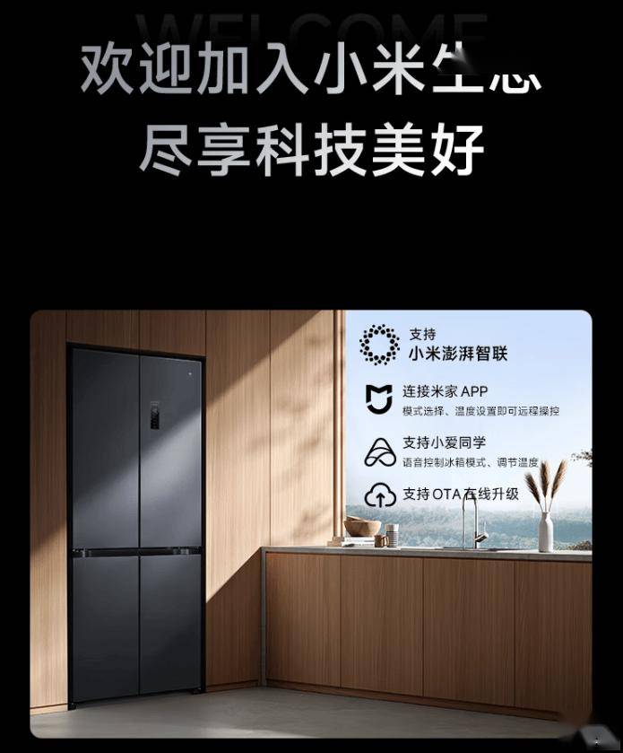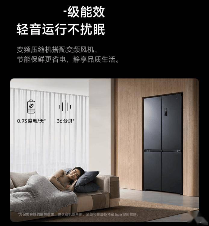 小米米家冰箱巨能装 Pro 十字 513L 墨羽岩拥有双变频一级能效(变频压缩机搭配变频风机、0.93 度电 / 天、36 分贝噪音),接入米家 App、支持小米澎湃智联、小爱同学语音控制、OTA 在线升级等功能。