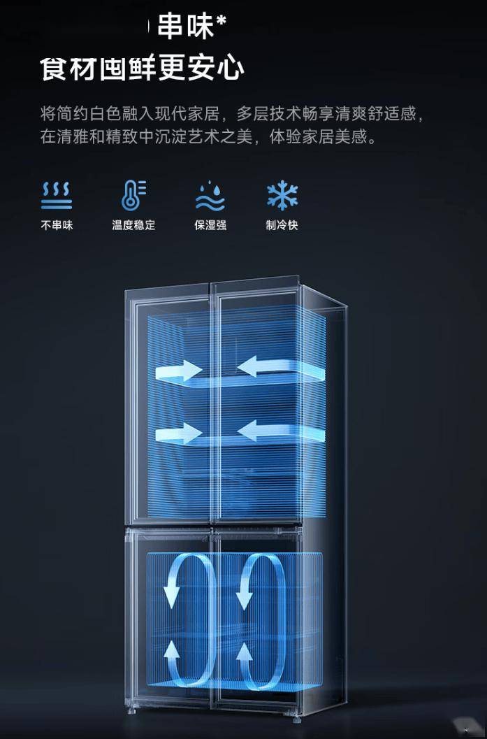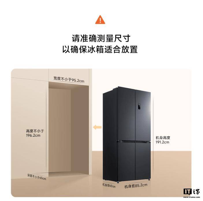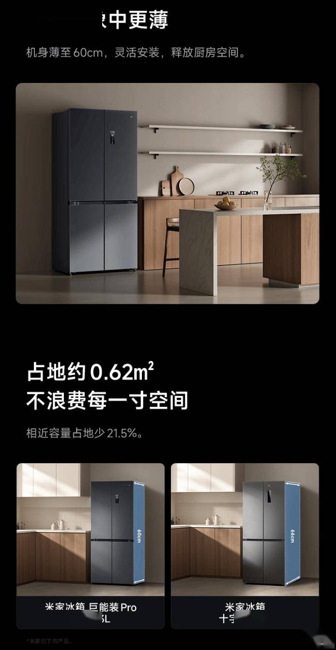 据介绍,小米米家冰箱巨能装 Pro 十字 513L 墨羽岩支持双系统双循环,宣称具备“不串味、温度稳定、保湿强、制冷快”特点。冰箱机身厚度约 60cm、占地面积约 0.62m²。
