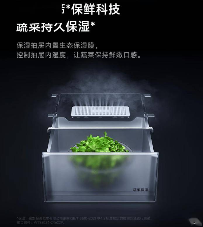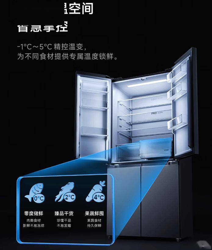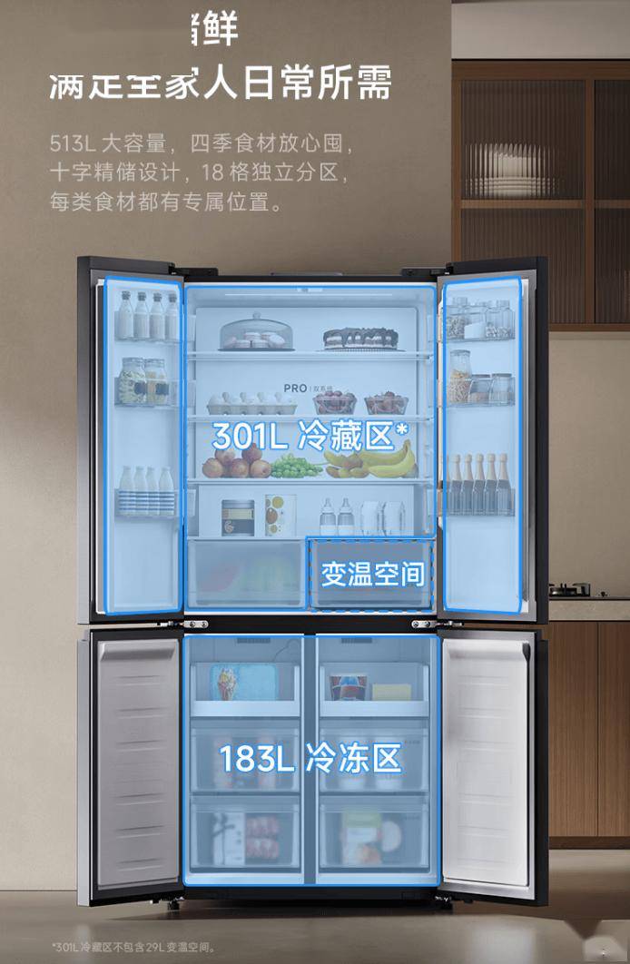 该款冰箱拥有 513L 容量(301L 冷藏区、183L 冷冻区、29L 变温空间),采用十字精储设计、配备 18 格独立分区。冰箱可调变温区支持-1℃~5℃温变、保湿抽屉内置生态保湿膜。