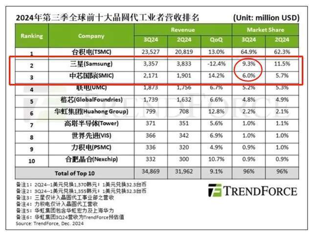 不仅如此,目前中芯和第二名三星的距离也不远了,如下图所示,中芯的份额在三季度时为6%,三星为9.3%,相差3.3%。