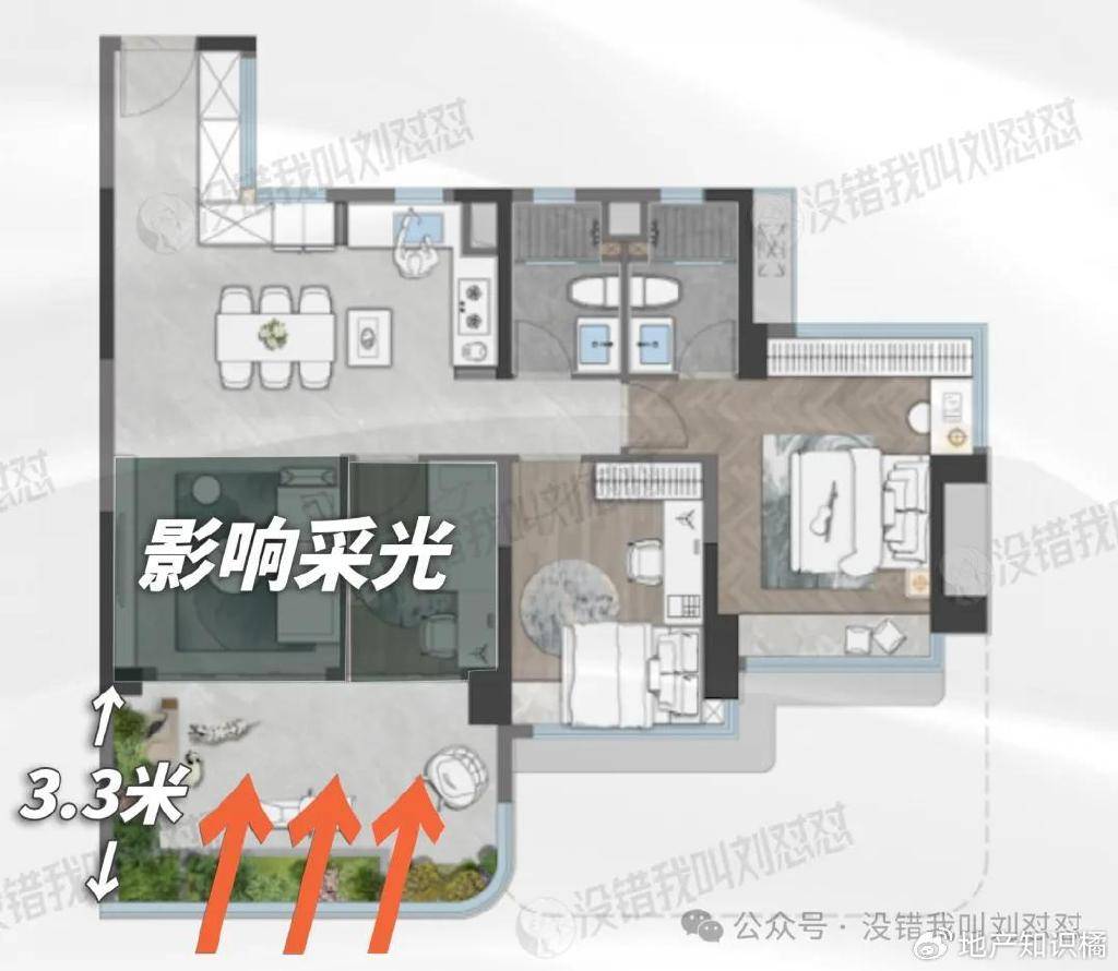 并且,阳台进深太大,很有可能影响客厅及餐厅的采光。