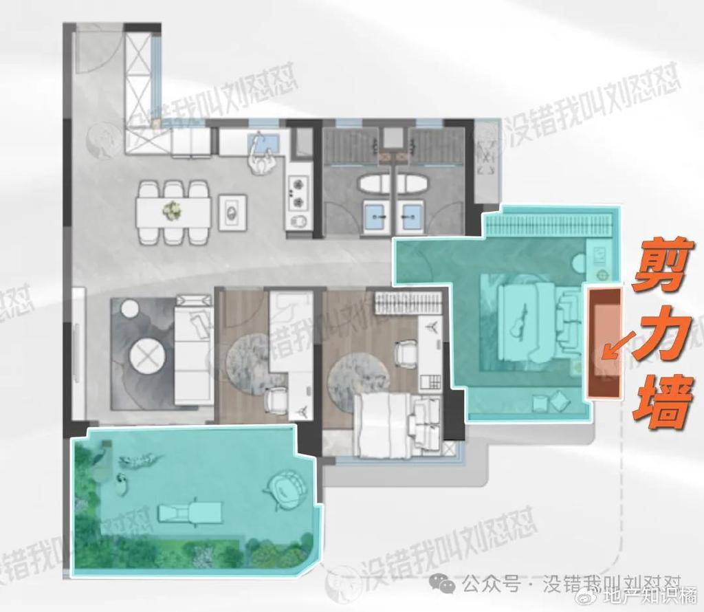 主卧也很神奇,明明可以做飘窗的位置,设计了很厚的剪力墙,损失了实际的得房率不说,主卧的套内也显得非常局促。