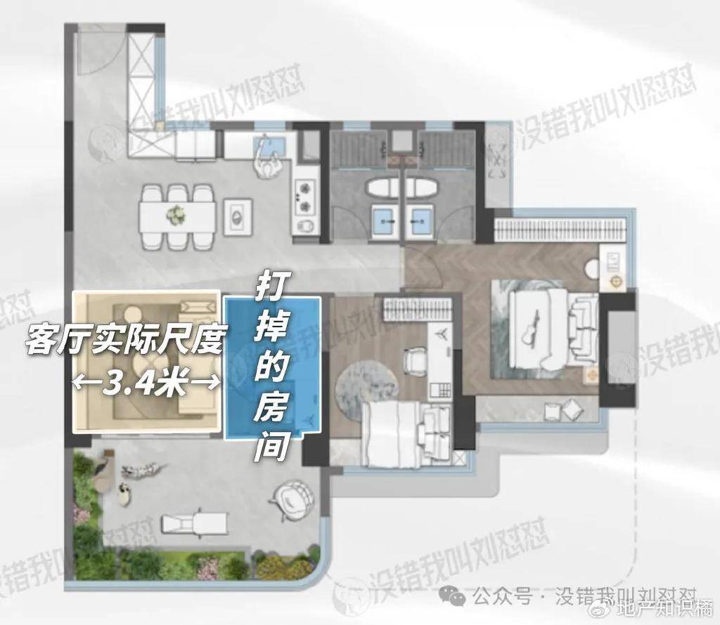 展示出来的异地样板间的客厅,已经是打掉一间房的样子了。