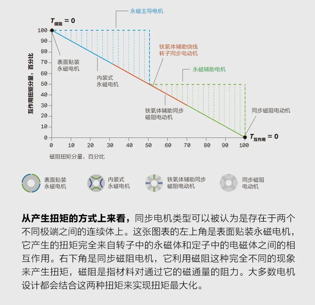 目前结合这两种扭矩的最常见的电机类型是内装式永磁电机,其中嵌入转子内的永磁体提高了磁阻扭矩。包括通用汽车、特斯拉和丰田在内的许多商用电动汽车制造商现在都在使用这种类型的转子设计。