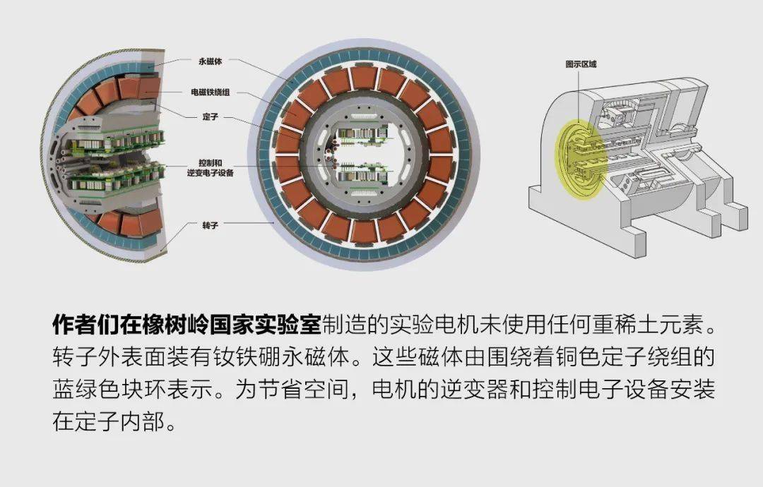 因此,设计这种电机的主要挑战在于转子冷却问题。去年,在美国橡树岭国家实验室,我们开发了100千瓦的牵引电机,其磁体未使用重稀土元素。其另一个很好的特点是它的电力电子设备集成在电机中。这类电力电子设备包括了逆变器,可从电池中获取直流电并以适当频率为电机提供交流电以驱动机器。