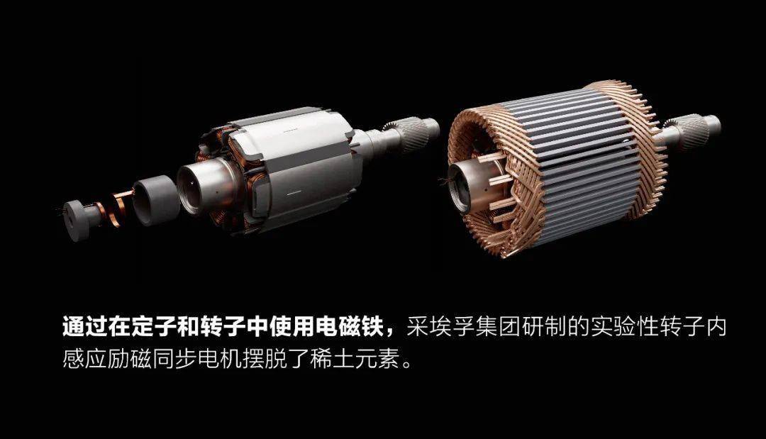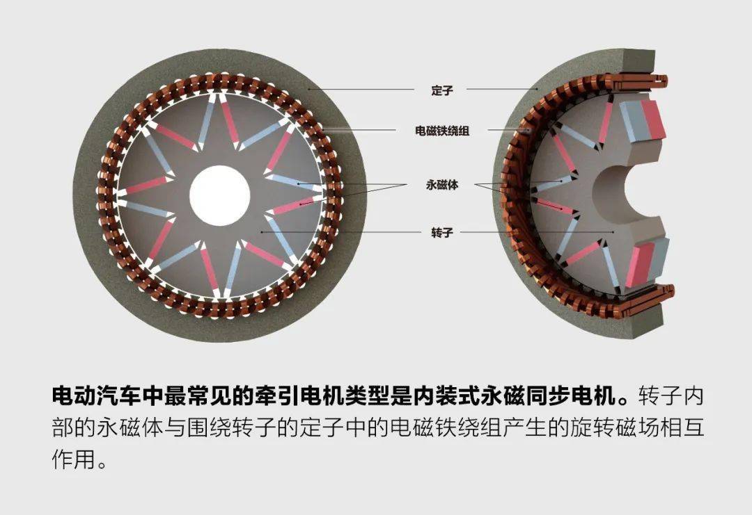 电机有两种基本类型:同步电机和感应电机。大多数现代电动汽车使用的都是转子配备了永磁体的同步电机。感应电机只使用电磁铁,因此不含稀土。尽管美国、欧洲和亚洲的若干研发项目正努力改进感应电机,但其性能通常无法与永磁同步电机相提并论,因此目前大多数电动汽车车型并未采用感应电机。