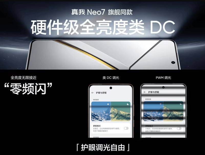 这款手机还支持硬件级全亮度类 DC 调光,宣称全亮度 1 Pulse 调光、体验近乎“0 频闪”。另外,该机还支持高频 PWM 调光、绿野 AI 护眼、类纸显示、自适应环境色温、舒眠模式。真我官方还开放全亮度 DC 调光和高频 PWM 调光 + 类 DC 调光供用户自由选择。