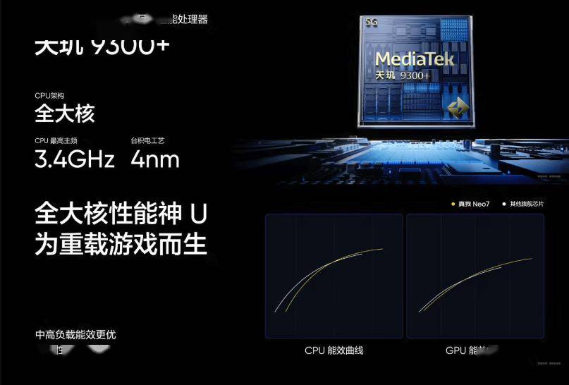 在性能方面,真我 Neo7 搭载联发科天玑 9300+ 处理器(CPU 架构全大核、台积电 4nm 工艺、CPU 最高主频 3.4GHz),支持芯片级超帧;内置 GT 性能引擎,宣称“高帧久、重载稳、功耗低”;拥有 7700mm² 目前行业最大面积单体 VC,支持苍穹通信系统 2.0。
