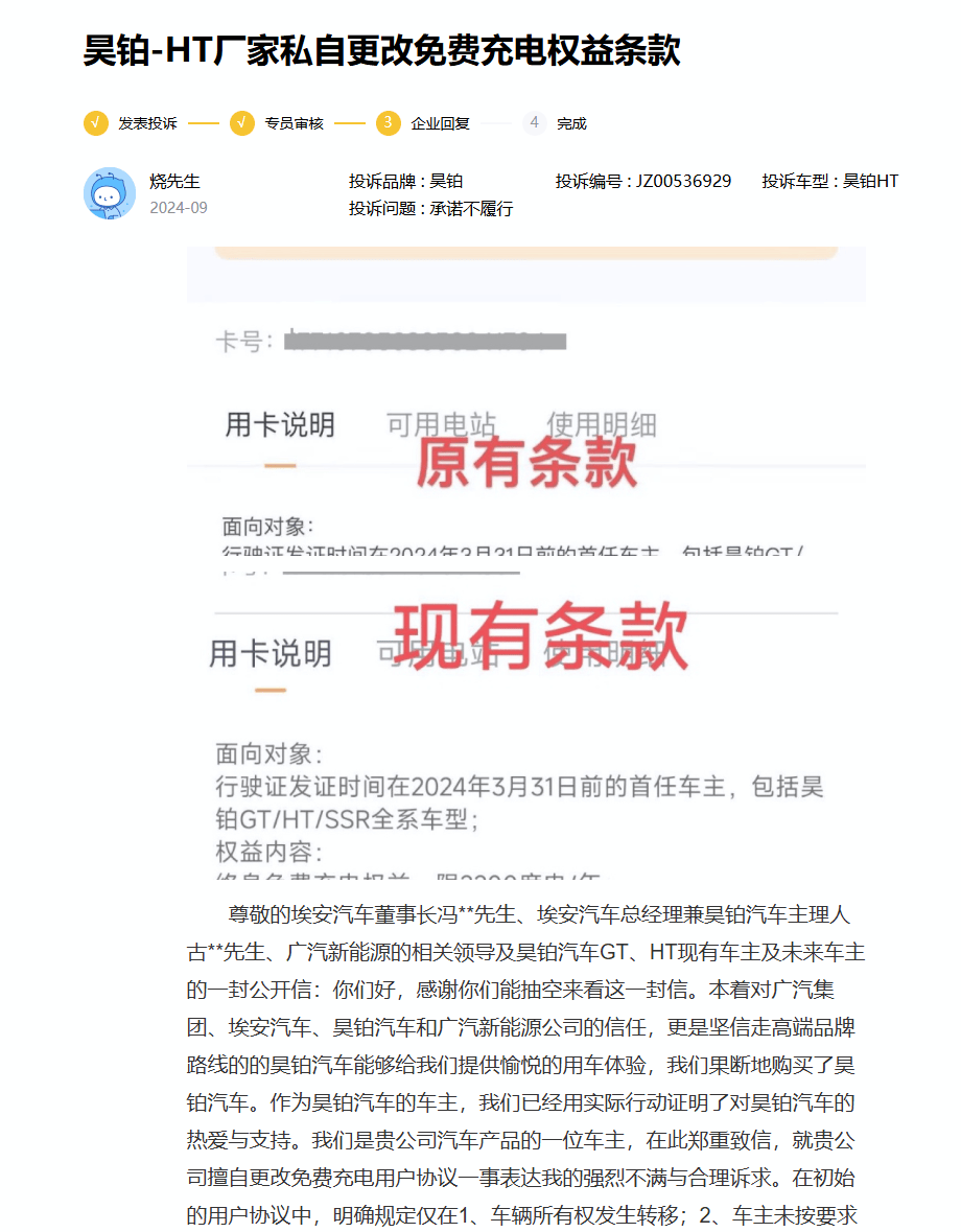 这一事件让车主深感失望和愤怒。他认为,昊铂品牌在销售过程中存在明显的误导行为,严重损害了消费者的合法权益。他呼吁昊铂品牌正视问题,立即采取有效措施解决充电权益变更带来的困扰,恢复车主应有的权益。