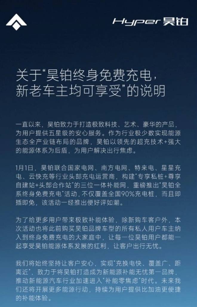 昊铂品牌曾推出终身免费充电权益,即每年赠送2200度免费电量,且该电量可在昊铂所有合作的充电网络中使用,覆盖市面上高达90%的充电桩(包括昊铂App内显示的所有充电站)。