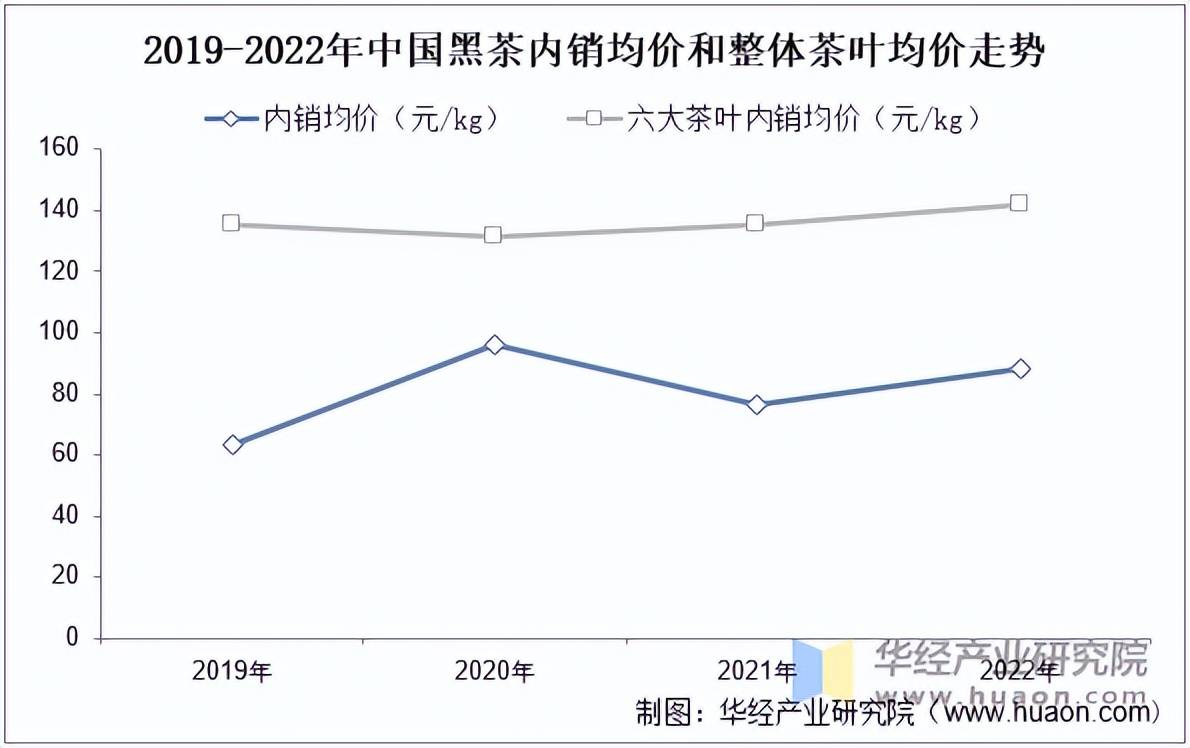 对比国内六大茶叶整体均价走势,2020年整体疫情背景下主要茶叶均价皆有所下滑,但黑茶受普洱茶金融属性等因素影响,不降反升,达到仅96.1元/kg,2021-2022内销均价分别为76.21元/kg和88.19元/kg,较疫情前水平有所提升,低于整体茶叶均价的主要原因是黑茶整体种植成本和人工成本较低且质量要求相对较低。