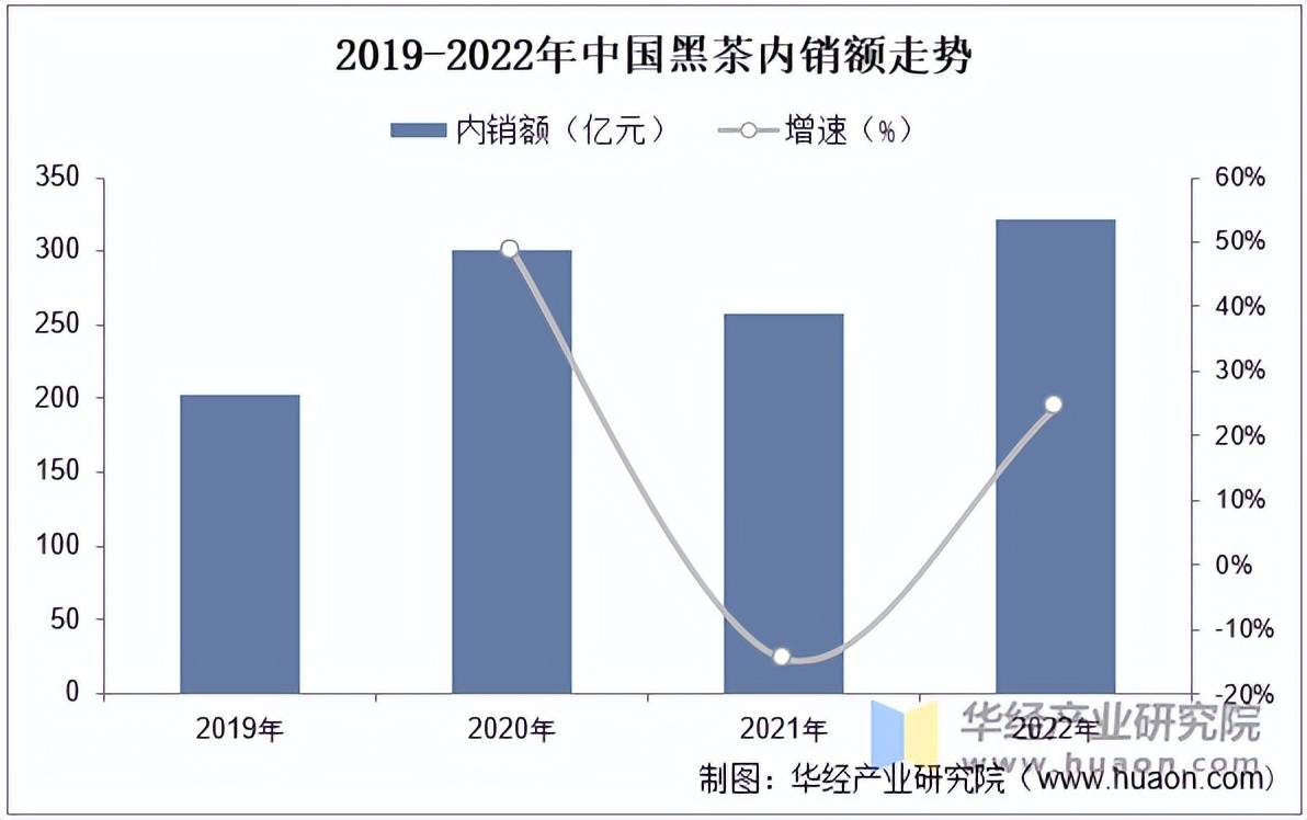 就我国黑茶内销额而言,虽然我国黑茶整体内销量在2019-2022年表现为稳步增长态势,但实际整体需求增长有限,2020年疫情背景下,采茶人工等费用大幅度提升,茶农出货意愿较低,整体黑茶价格较高,是2020年内销额大增的主要原因,随着2021年疫情结束,供给过剩背景下黑茶价格回落疫情前水平,内销额下降明显,2022年整体黑茶量价齐升,内销额达321.35亿元,较2021年增长24.5%。