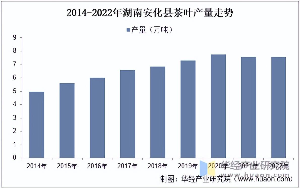 湖南益阳安化黑茶是我国最著名黑茶来源,数据显示,政策推动安化黑茶相关标准完善同时品牌效应提升,我国安化黑茶产量持续增长,数据显示,2014年我国湖南省黑茶产量持续提升,从6.12万吨增长至2020年10.26万吨,2021年小幅度下降,仅为10.19万吨,安化茶叶产量从2014年的4.95万吨增长至2021年的7.56万吨,2022年较2021年基本无变化,产量仍为7.56万吨。